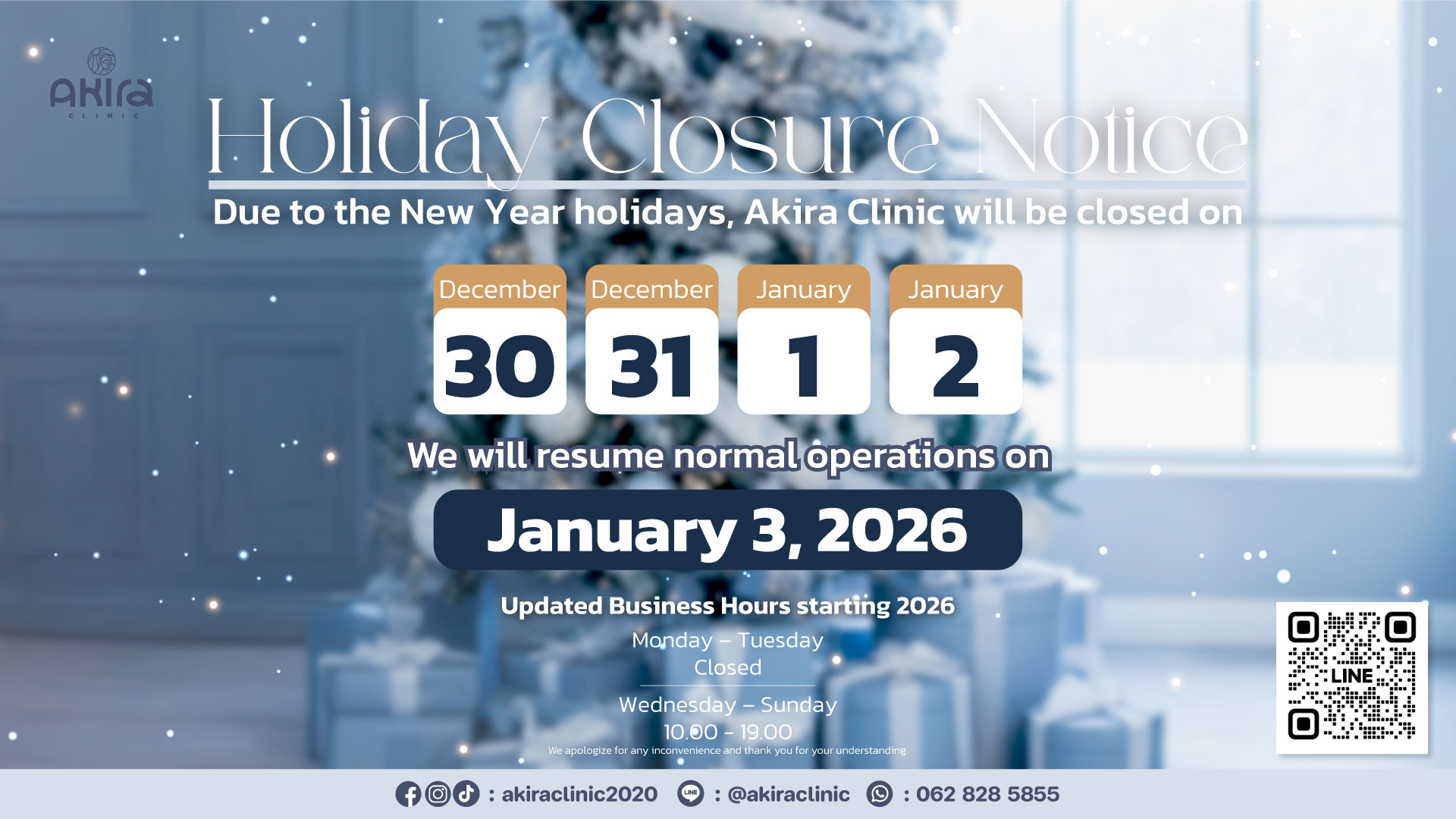 Akira Clinic would like to inform our valued clients that the clinic will be closed for the New Year holidays during the following period: